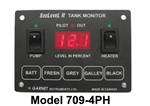 The Seelevel II Model 709-4PH Tank Monitoring System is designed for RV's with 4 holding tanks and includes a water pump and water heater switch. Now you can monitor your batteries, fresh water, gray water, black water and a kitchen (galley) tank levels digitally in percent full accuracy. The 709-4PH series utilizes 12 inches tank senders that can be stacked to a maximum tank height of 24 inches. Tanks are monitored using Garnet's proprietary external level sensing technology providing accuracy not found in most other systems. Tank senders connect to display via a one wire bus setup which saves wiring costs. LPG tank connection compatible with existing electric senders. Includes Water Pump and Hot Water Tank Switches with monitoring LEDs indicating pump on and pilot out indication. Includes monitor, connector assembly, (4) ES tank senders and owners manual.