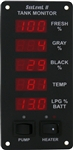 This system provides an outstanding balance between low cost and full features. Instead of single points that give you only a close approximation of how full your tanks are this system offers a continuous level and shows an actual number, in percent of full. Provides alarm for fresh, grey and black tanks.
